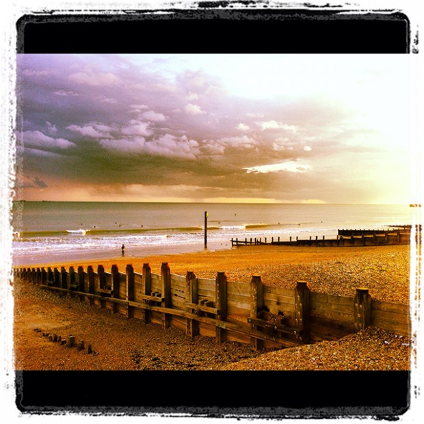 “This shot was taken with my iphone one evening after work as the sun was setting at a spot called hot pipe. The light was ethereal and sea calm and glassy with moody clouds about. Waves were small but super clean for this area of south coast and these waves were the result of a ground swell sneaking (struggling) up the English Channel. We must all wish we were 2ft tall or shorter when this happens… Well… That’s what I dream of…” Photo: Christian Williams.