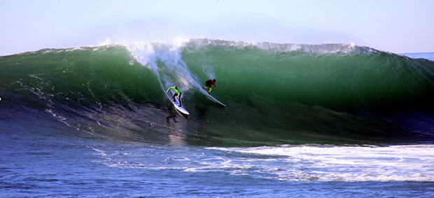 Elijah Crowell captures Mark Healey and Shawn Dollar splitting the peak at this year’s Mavericks invitational. Photo: Elijah Crowell.