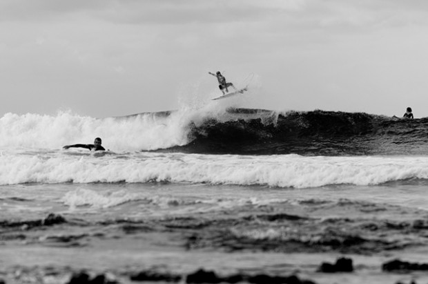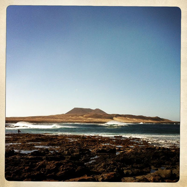 Pablo Cabrera emailed today to ask if iPhone snaps are permitted. The answer is yep. “From la Graciosa island, this day the winds where strong NE and we went to check the famous El Corral. It was horrrible cross shore. We decided to walk a bit and got to this slab. It was just the 4 of us. I was the first one out (that’s me avoiding sea urchins!) Meanwhile my friends decided to get naked and tan their willies a while… that is until they saw me catch my first wave at which point they were out there!” Hang on one sec, if you’re the one on the rocks Pablo who’s taking this photo?