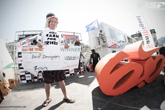 Brent Dorrington (Gold Coast, AUS) won the ASP Europe Specialty 6.0 Cash for Tricks Zarautz event Sunday in the Basque Country, the talented competitor unleashing the most impressive flying tricks to finish atop a solid contingent including Cory Lopez (Florida, USA).