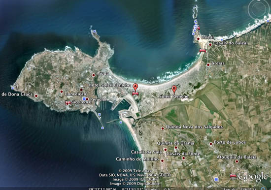 The Peniche Peninsula, as seen from the Surf Europe satellite this afternoon at tea time.