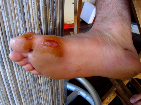 Fuck, I’ve been here a week and only surfed twice. I cut the foot last Tuesday out the front (OTW). It wasn’t even a big wave, I just fell in the wrong place and hit the bottom. I didn’t think it was anything but it’s kept me out for a week. I’m hoping I’ll be able to surf again tomorrow or the day after, it’s in a bad spot, right where my foot goes on the tailpad.