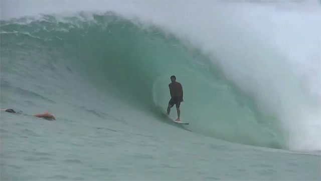 5. Two over from that with the black lines on the bottom, that’s the magic one. 5’7” quad flex tail by Luke Studer made in Bali. My older brother Mikala and Luke live in Bali and are constantly experimenting on boards, so I’m lucky I can reap the benefits every summer. This was the first quad that I ever had that could do everything and more than a thruster could. It’s one of those rare boards that works from waist high to 8ft Bali barrels. The flex tail gives it extra spring out of turns as well as smooths everything out.