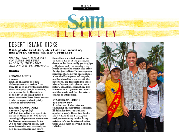 Doing the Desert Island Dicks page of Surf Europe can at times be a bit like… eating sweaty bum crack – except not as fun. Then at other times, you think, holy mushroom biryani, this guy is good! When Cornish malibu enthusiast Sam Bleakley revealed his must-take LPs to me in a Chinese hotel room this October, I semi got a demi. He had some awesome selections and some righteous reasoning. Check he: