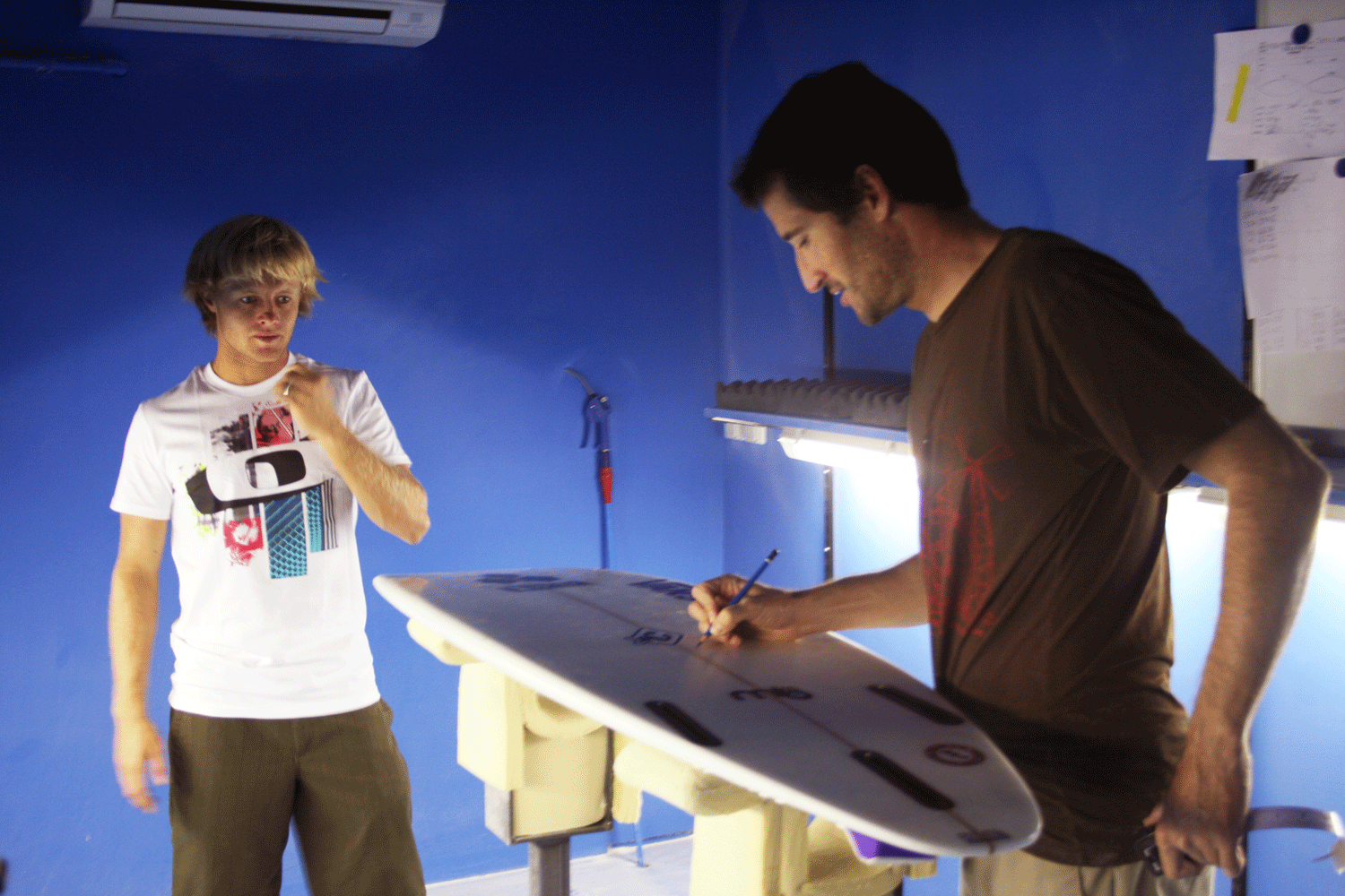 It’s busy time for any contest surfer in Europe. Lacanau is over, Zarautz is about to start with so little time to fine tuned the equipment and so little waves to test it. But guys are happy to be at home or at least not too far from it. They use those few days in between heats to visit their family, friends and relatives but also their shaper, to talk shop, rocker and width.