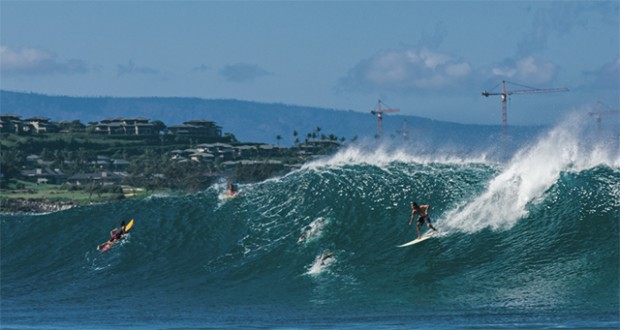 Cranes on the horizon of a beautiful surf spot usually signal a sinking in the heart of the surfer – unless of course he‘s doing price work. Honolua Bay, Maui. Photo:Timo