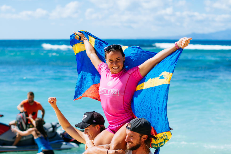 Johanne Defay, winner of the 2016 Fiji Women’s Pro, showered smiles on the congregation in the Cloudbreak channel, and more smiles still as she returned triumphant to Tavarua, resplendent in pink and bearing aloft the flag of her homeland.