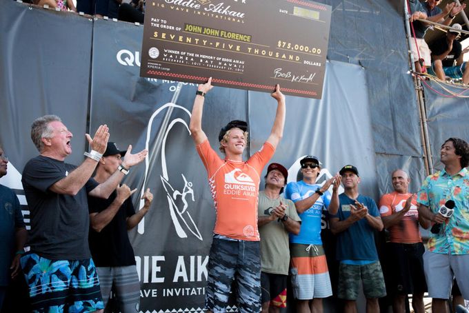 It was the biggest Waimea in Eddie history; the ledge was terrifying and the wipeouts were hideous; the pace was a little slow at times, but the cumulative effect of the drama was intoxicating. Over two rounds of four seven-man heats John John Florence emerged as the clear victor, his top four waves amounting to a total of 301 out of a possible 400. He was out in front after Round 1 with 170 points, and in his second heat regained the lead from Ross Clarke-Jones with two scores in the high 80s. Clarke-Jones, who won the Eddie in 2000/2001, finished on 278; Shane Dorian came in 3rd with 270, followed by Jamie Mitchell and Kelly Slater.