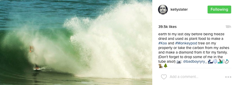 “My last wave in Portugal the other day. Sick little bank with just @patchy_o and myself. Hugely inspired by the young guys on tour these past few months and what @john_john_florence has accomplished this year. So next year I’m gonna get my shit (and my body) together for real and see if I can make a last run at a title. Then I’ll go find the best waves on earth til my last day before being freeze dried and used as plant food to make a #Koa and #Monkeypod tree on my property or take the carbon from my ashes and make a diamond from it for my family. (Don’t forget to drop some of me in the tube also!)”