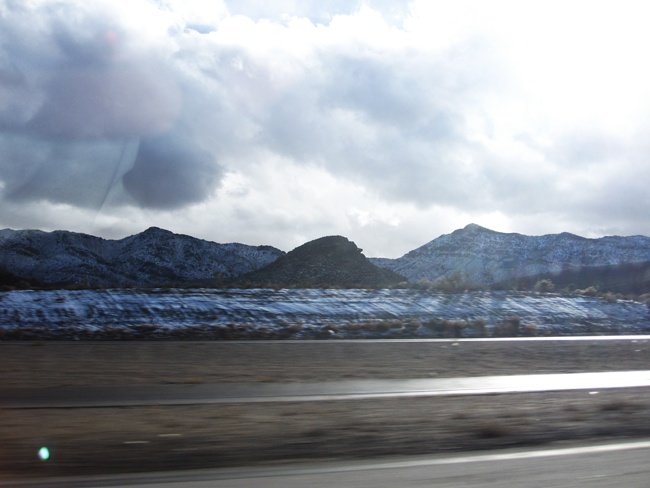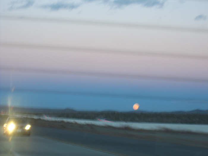 A while after the moon rose over Nevada behind us. There was a light dusting of snow on the hills. With each mile that passed I was a mile further away from Vegas, orange bile and a very, very, lower-than-Death Valley low ebb.