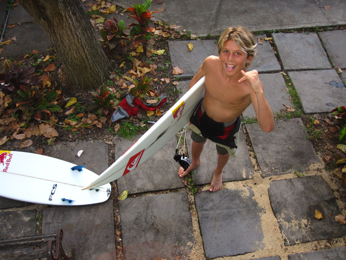 If you’re wandering around da Ke Nui road anytime of day or night and you can smella di pasta, that’s probably the scent of the Fiorvanti family, Italian shredders extraordinaire. They’ve literally set their people back 400 years by living out everybody’s Ital stereotype and eating pasta 3 meals a day. Last night it was carbonara. Lil’ Leo aka the next Kelly Slate shredded 8ft Sunset yesterday on his gun. His gun is 5’8″. Here’s the 12 yr old sensation about to go for his third shred of the day out at macking Gas Chambers.