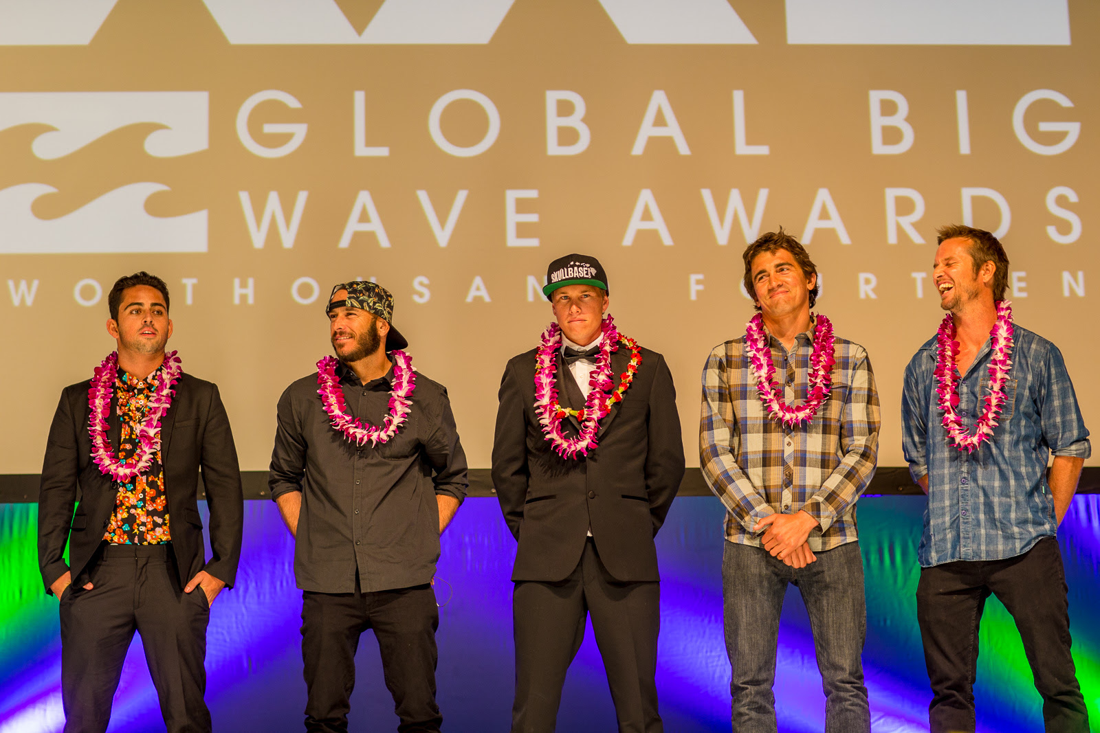 The nominees for this year’s Billabong XXL Ride of the Year L-R Billy Kemper, Shane Dorian, Shaun Walsh, Greg Long and Grant Baker, with the win going to San Clemente’s Greg Long. Image: ASP / Richard Hallman