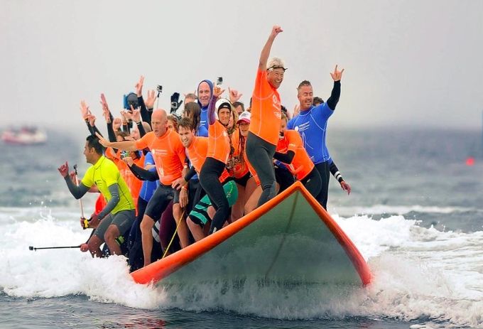 Several world records fell by the wayside at Huntington Beach last Saturday, as a total of sixty-six surfers — among them Lakey Peterson and people’s hero Brett Simpson — crammed onto a massive surfboard and surfed a wave in celebration of International Surfing Day. We use the terms “surfed” and “wave” loosely (see below).