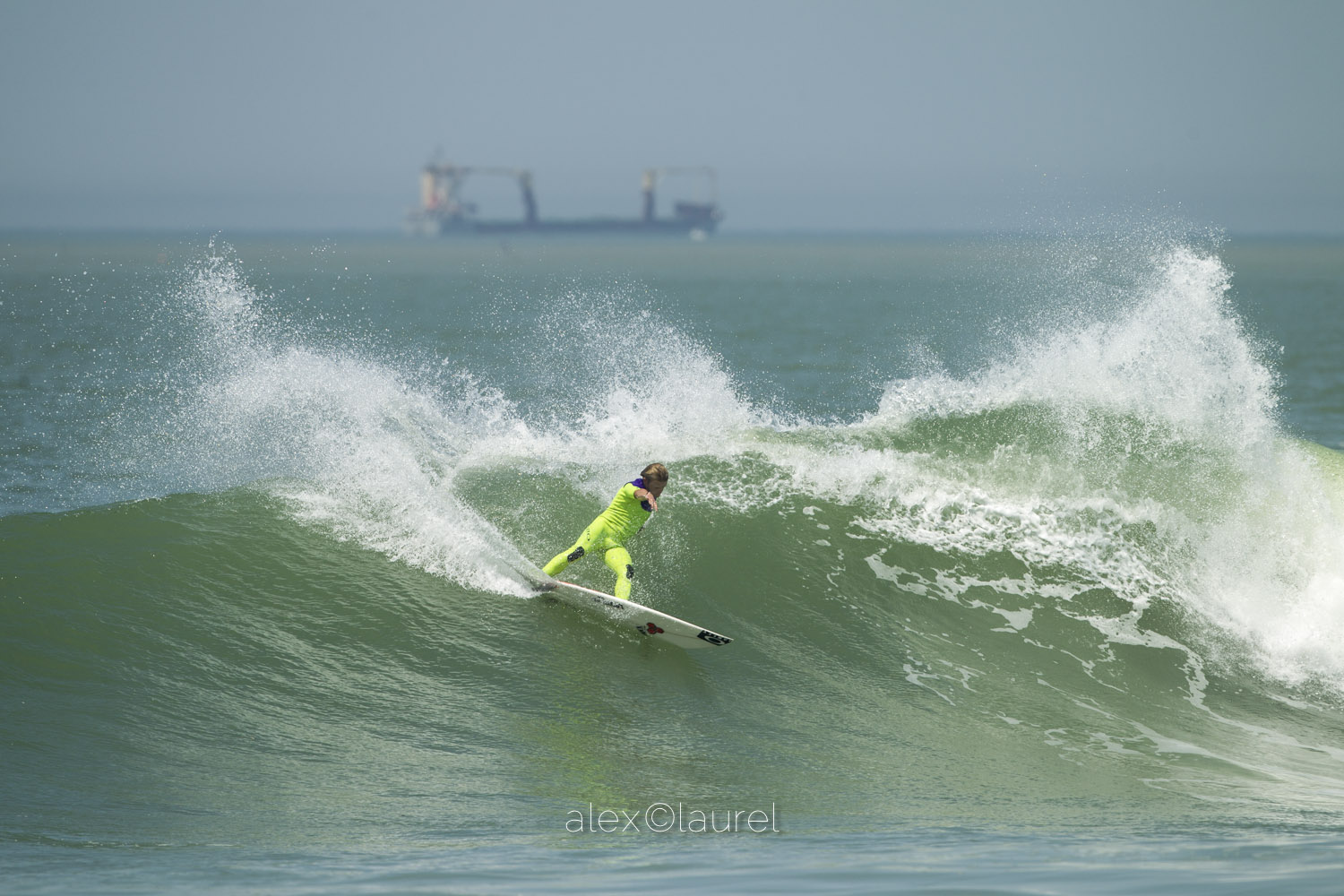 Romain Cloitre lays down a mighty arc at le club, Anglet yesterday. In the background, the sinister form of a giant dredging ship sucks sand off the seabed outside the lineup of the Anglet beaches, much to the disdain of the locals. Since the dredging, reports are that the banks at Anglet have never been the same, the natural balance of beach nourishment being starved of the vital offshore deposits that go to build up the beach.