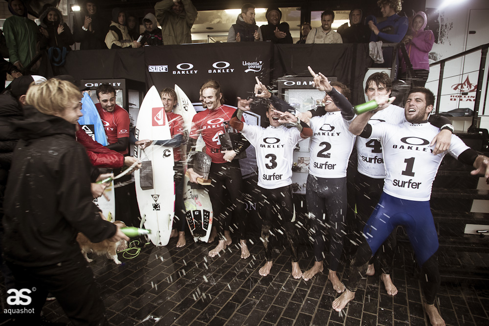 SB3 Surf Shop of Soorts-Hossegor, France are the happy winners of the Oakley Surf Shop Challenge Europe, and will be heading to Bali for the ASP Oakley Pro Bali WCT at Keramas! In 2-3ft (waist to chest high) surf, the SB3 team of Aldric God, Jordan Oueslati, Yann Martin and Teddy Santin narrowly defeated locals Mario Azurza, Adur Letamendia, Jaime Azpiroz and Imanol Yeregi of Pukas at Playa Zurriola. The European final topped off a long day of surf action in San Sebastian, that saw eight teams from across the Iberian peninsula do battle for top honours.