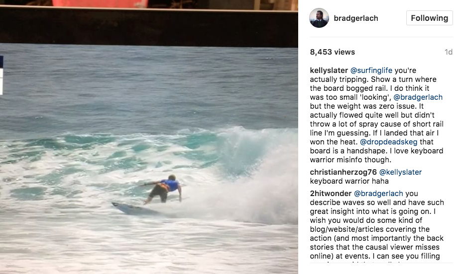Brad Gerlach said something about Slater’s board looking light. A few others weighed in. Surfing Life Magazine put their oar in too. Slater’s repost was like a Batman (original TV series) fight scene.