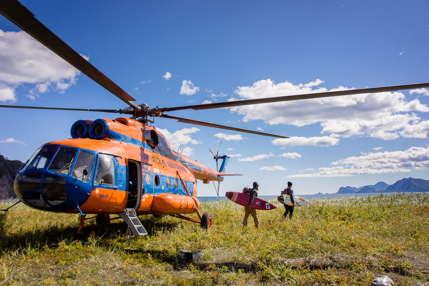 The helicopter’s engine screamed. Thousands of rivets zig-zagged across its back and rattled in their sockets. It was a dinosaur, an Mi-8 model hatched from Soviet days of glory over 40 years ago. A thick outer shell encased the cabin and bulged upward in a sort of hunched back beneath the rotors. The back cabin narrowed into a long, angular tail with a rear hatch for loading supplies. The thing smelled like fossil fuels. Inside we had enough room for all of our camping equipment and surfboards. Because it was old, the chopper had been painted bright orange to give it a fresh feeling. But these things went down all the time.