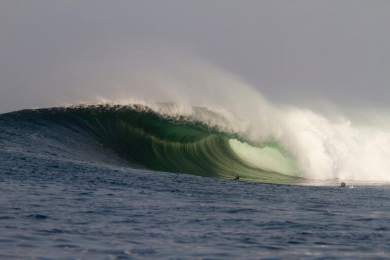 But we waited for the south swell. It was due to arrive any time now. South swells had a more robust period. And when it finally arrived it was all rights—long, racing, and accompanied by a running current. The sandbar was shallow like a shelf, and waves sucked out along its edge. They detonated in a foot of water, onto hot black sand, head-high, hollow, and crystal clear.