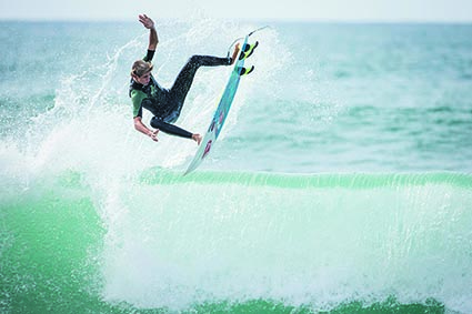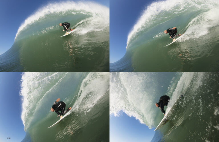 Meanwhile, Dane fought his way to the peak. He found a set wave and sped through a series of bottom turns and top turns, snapping tight arcs and sending spray far into the air. Trevor dropped into the next one and traveled through a racing barrel section, finishing the wave with a wrapping roundhouse. Further down the beach, Keith pulled into a hollow wall backside and launched off the inside section. Cyrus waited outside for the next wave. He paddled in early and drew a speed line across the face on his asymmetrical board. He grabbed rail and pulled in. At the very end the barrel pinched. He bailed his board and body surfed the rest of the wave onto the sand.