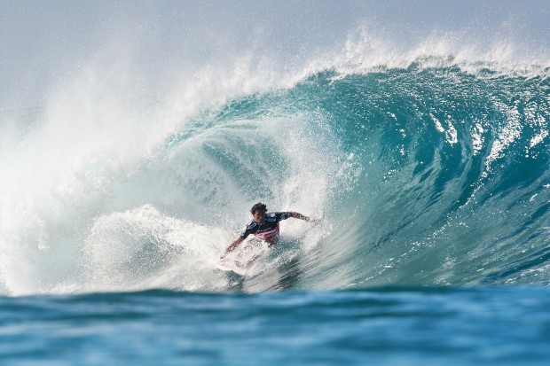 Bede Durbidge will vouch for that. Just after getting a 9.4 screamer on a left, and taking command of the heat, his next right featured a doggy door lip to the right earhole and a courtesy lift on the beach ambulance. His opponent Nat Young then added further pain, scoring a heat winner with two minutest to go.