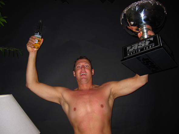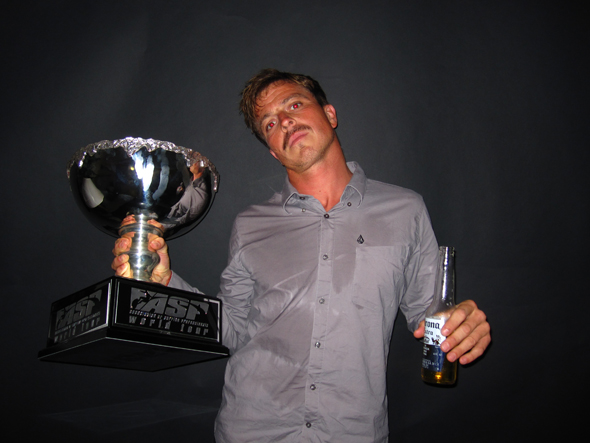 Me with the ASP World Title trophy. That’s not sweat, it rained as I was cycling over for dinner.