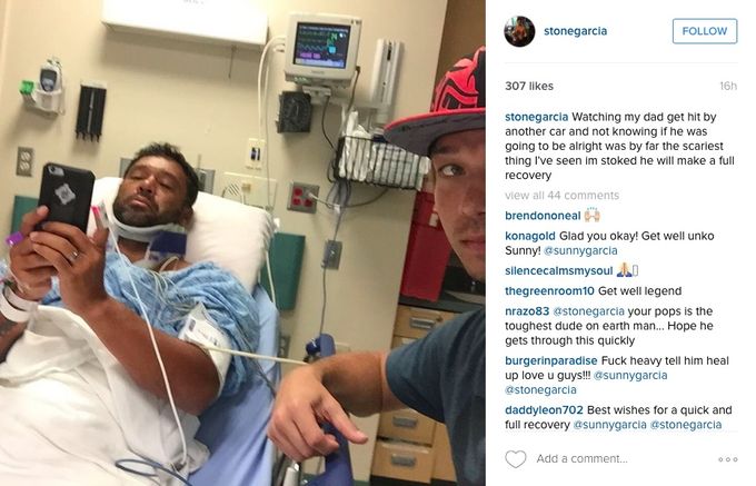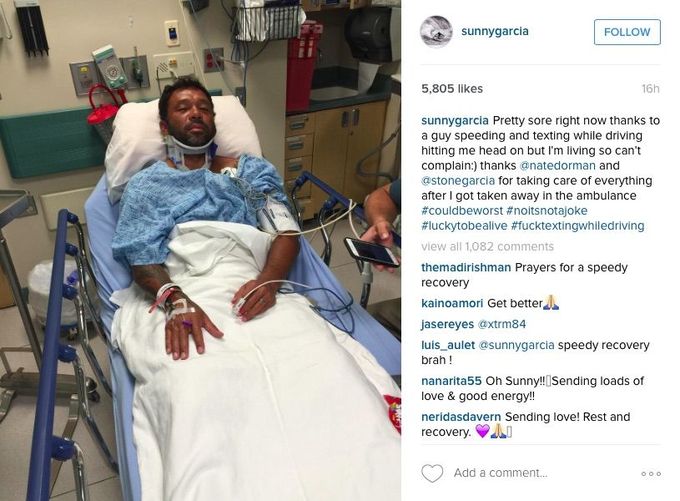 6-time Triple Crown winner and 2000 world champion Sunny Garcia says he’s lucky to be alive after he was involved in a head-on car crash. The accident, apparently caused by the negligence of the other driver, has left the Hawaiian temporarily bedridden in hospital, strapped up in a neck brace. He wrote on Instagram: