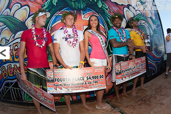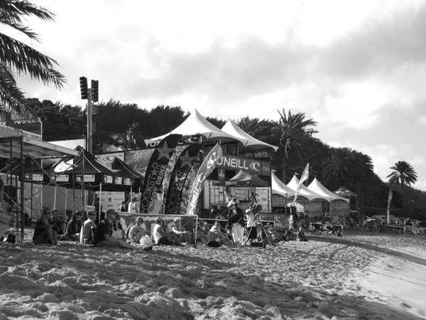 This is da beach scene. In case you are unfamiliar there’s a bike path/pavement and then about 10m of sand and then the drink. That’s it. Considering it’s one of the most prestigious surfing events in the universe, and considering that today is still school holidays from Thanksgiving, it’s still a little surprising that the gathered crowd is more modest than that at your average Sunday league pub football match in the pouring rain. I guess the expectant hordes must all be watching the webcast/waiting by their computer for this post.