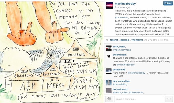 This one’s a few weeks old now, but we felt that such an accomplished piece of artwork was deserving of a wider audience — not too many people seem to follow Bobby Martinez on Instagram. We also admire the lengths Bob continues to go to just in order to say “fuck you” to the surfing powers that be. Bobby fucked the WSL (back then the ASP) good and proper, and I’m not sure he really makes any money out of surfing any more; most of his current income derives from the sales of these delightful pencil crayon drawings, to which he devotes himself with tireless dedication, producing roughly ten a day.