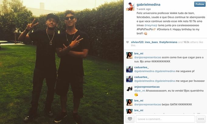 Gabriel Medina may now have a world-title in the bag, but you never know when the gravy train might dramatically derail. For this reason he’s been practising his football skills with homeboy Neymar Jr., who is trying to convince the Brazilian coach Dunga that the national side could do with some of Medina’s steel in the centre-back position.