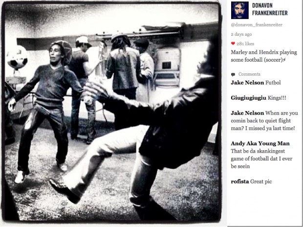 5) Donny Frankenreiter, himself stuck in a ’70s timewarp, found this photo and put it up. It has absolutely nothing to do with surfing, but when was the last time you saw Bob Marley and Jimi Hendrix playing keep it ups?