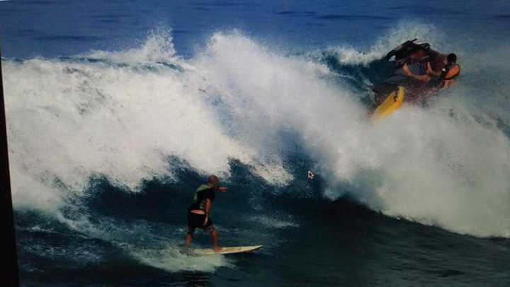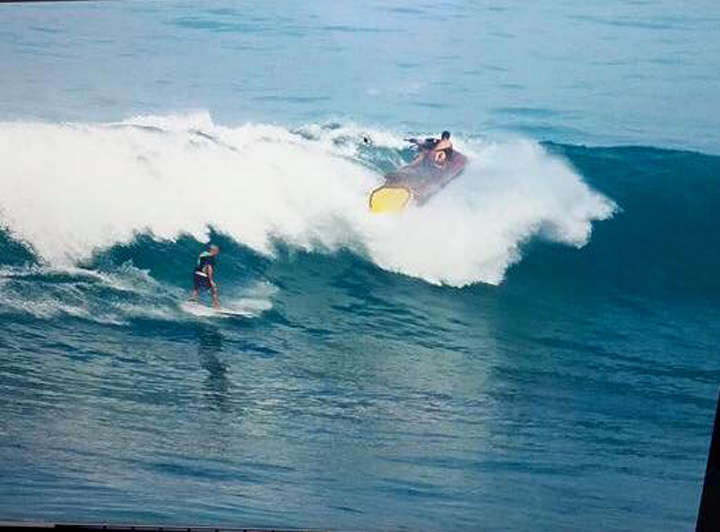 And before anyone says, “well he shouldn’t have dropped in then” — does a surfer not renounce the principle of mutual respect the moment he or she takes a jet-ski into a busy line-up on a barely overhead day? Discuss.