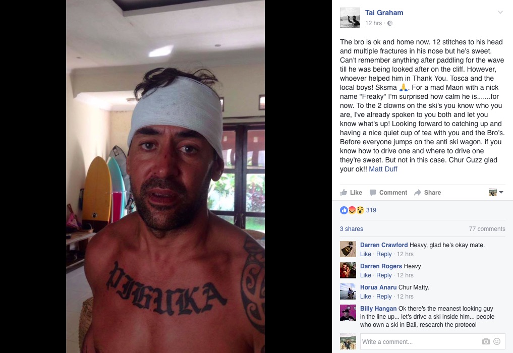 Pro surfer Tai Graham, who owns the Single Fin Bar stationed at Uluwatu, wrote on social media that the surfer hit by the ski, Matt Duff, remembers paddling for the wave and being attended to on the cliffs, but nothing of the intervening period. “For a mad Maori with a nick name ‘Freaky’, I’m surprised how calm he is,” wrote Graham, before adding a few stern words for the benefit of “the 2 clowns on the ski’s (sic).” Duff, for his part, chipped into the comments with a typically Kiwi reassurance: “All good Mum… A little sore but sweet as.”