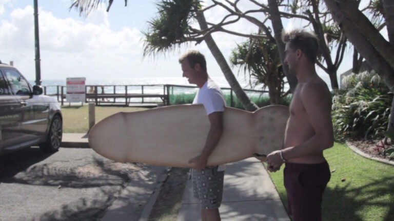More penis shaped surfboard laughs with the Aussie wave riding comedian in "A quicky with Taj Burrow".